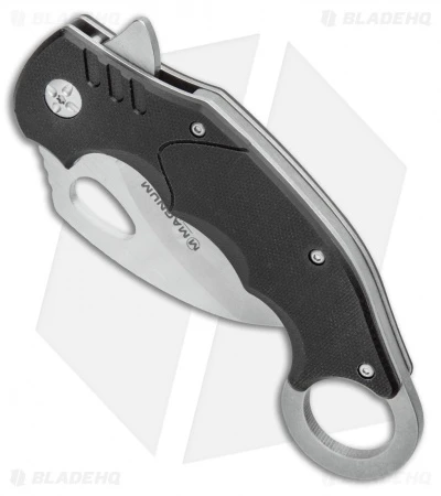 The Boker Magnum Dark Claw folding karambit knife features a two-tone satin and stonewashed blade made from 440A steel. It flips open easily and runs on a ball-bearing pivot system. A pocket clip is included for tip-up or tip-down carry, providing multiple carry options.
