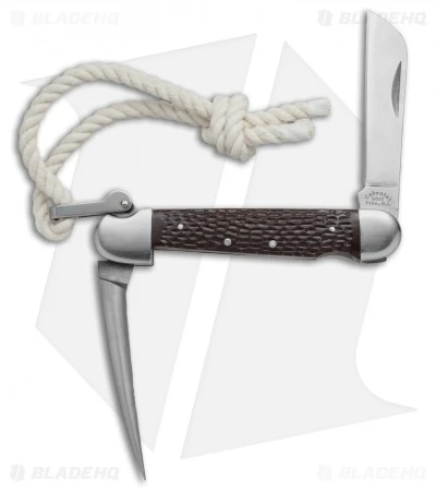 The Colonial Knife Co. Marlin Spike pocket knife is the rebirth of classic U.S. Navy sailor’s knives. This knife features a sheepsfoot blade and a locking marlin spike designed to safely tackle cutting tasks on the water. Its handle has brown Zytel scales with a sculpted texture for a secure grip. Includes a length of rope for easy carry.