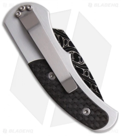 This Limited Edition Custom Runt J4 features a Chad Nichols mosaic high carbon Damascus blade. The handle is silver aluminum with carbon fiber inlays and a matching push button insert. The pocket clip is satin finished titanium.