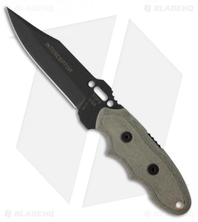 The Interceptor River Hunter #351 features a clip point 1095 high carbon steel blade and black linen Micarta scales. Includes Kydex sheath with rotating spring clip.